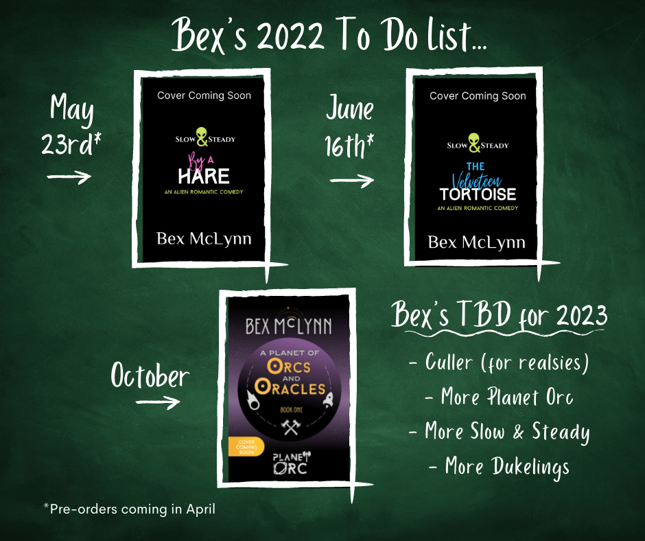 In the beginning of 2022, I said ‘E-FREAKING-NOUGH! I’m writing Culler!’ and ended up plotting Let Down Your Hare (Slow & Steady, book 3), started plotting the entire Planet Orc series, and have begun jotting down ideas for two more Dukeling books.